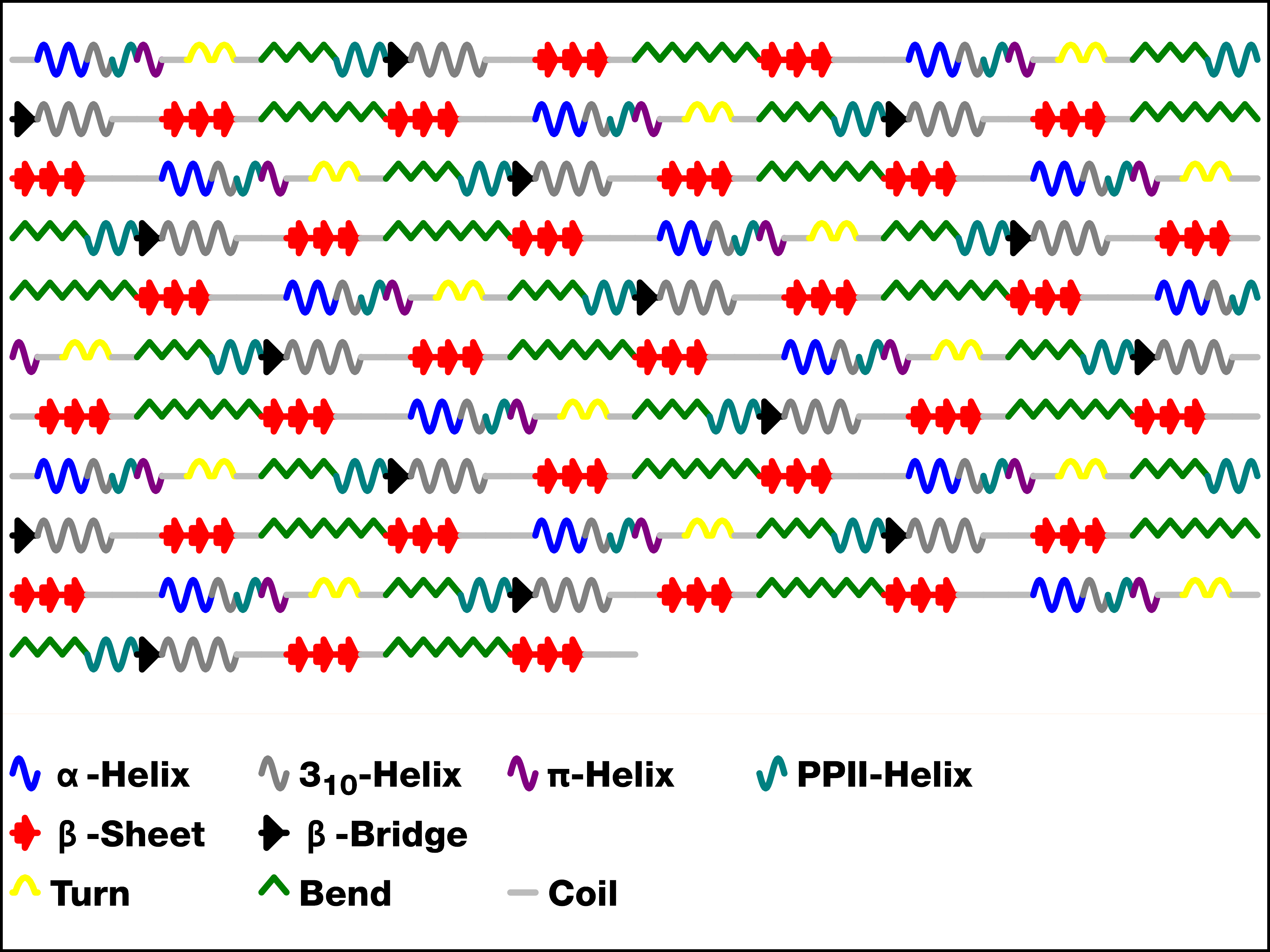 我以前写过一个bash脚本dssp2gp, 用于绘制蛋白的二级结构演化, 脚本支持一个fancy选项, 可以绘制形象的二级结构示意图, 但较少用到. 最近想到, 可以将这个功能改造一下, 独立出来, 变成一个绘制蛋白序列和二级结构的工具, 因此也就有了ss2gp. 网上也有一些类似的工具, 但这个轮子我还是造了.